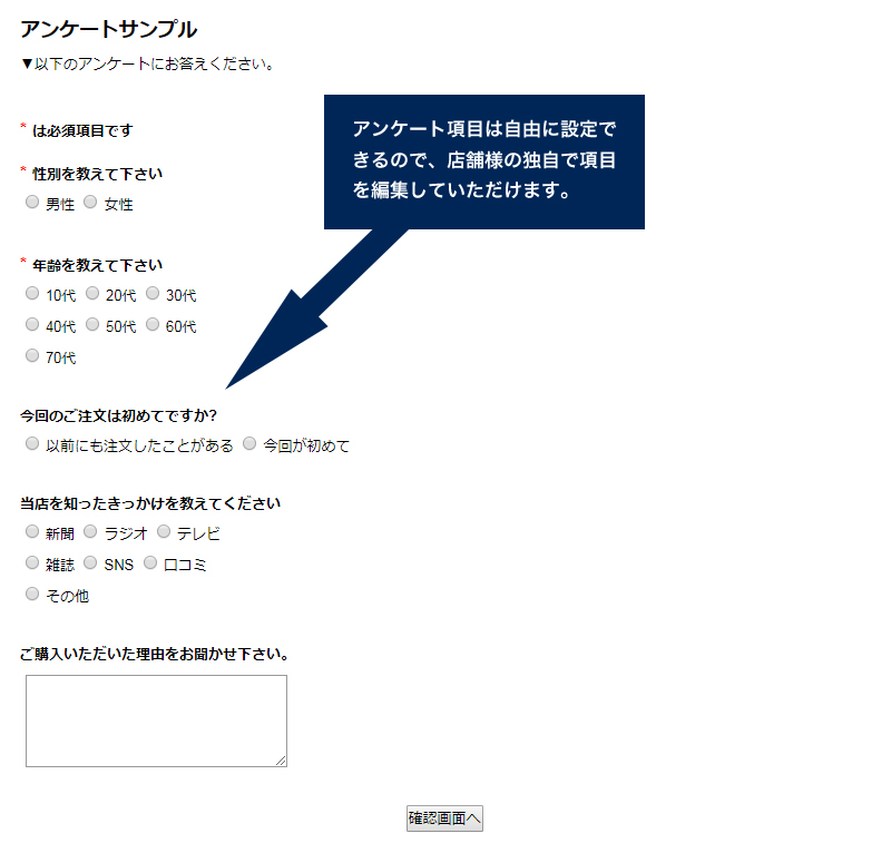 店舗様の知りたい情報に合わせてアンケート項目の編集が可能です。